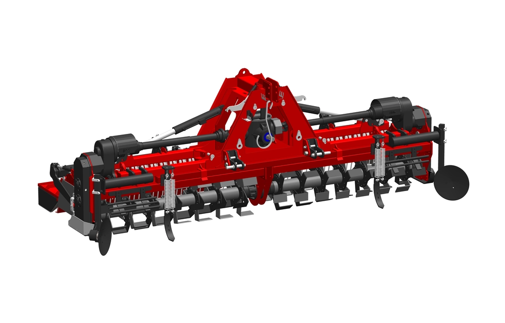 - Integrated Structure: The machine’s structure consists of a single central three-point hitch and two rotavator units on the sides.